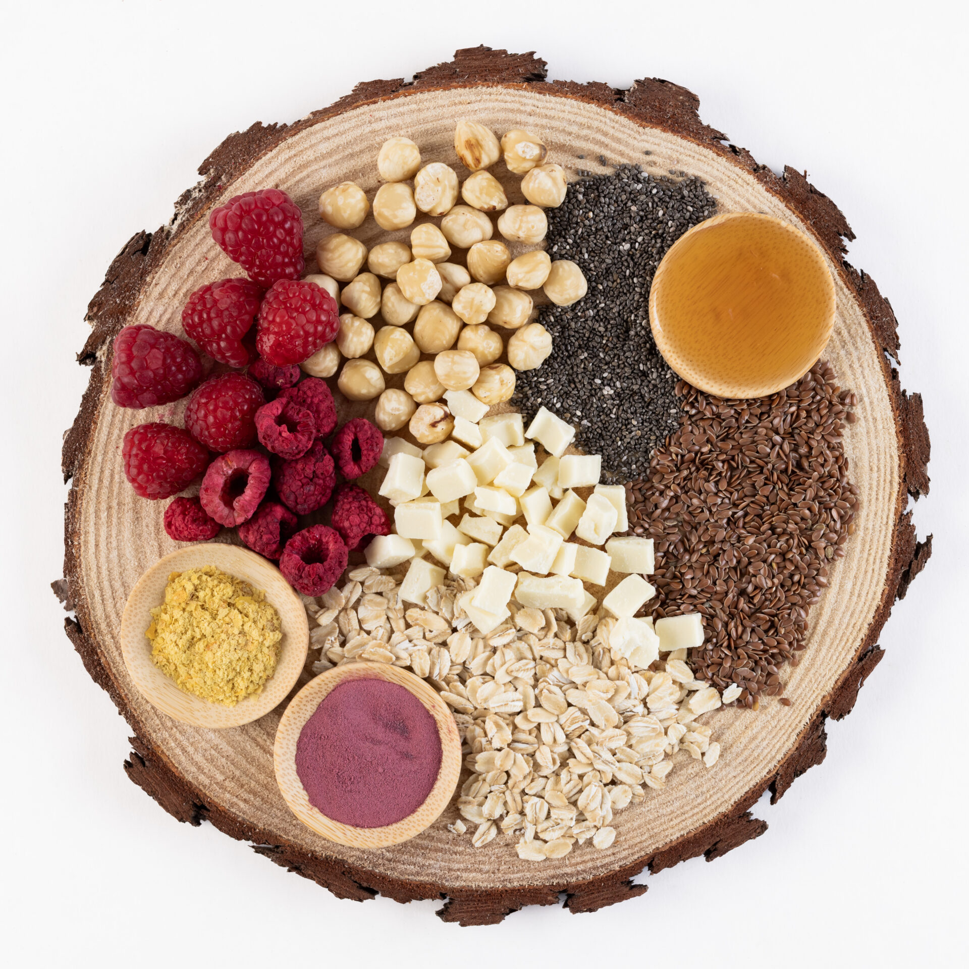 • Naturally sweet hazelnuts are brightened up with tart raspberries in this delish bar.